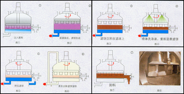 6、清洗徹底:由于此設(shè)備具有自動噴淋和重新打漿的功能,濾餅可以得到非常徹底的清洗。并且洗滌液用量較其它類型設(shè)備少,可減少排污量和降低廢水處理費用。