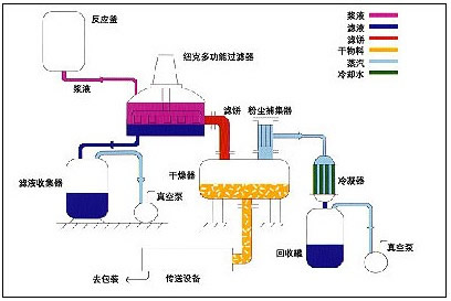 4、操作連續(xù):能夠使過濾和干燥在一個連續(xù)的系統(tǒng)內(nèi)進行,毋須處理濕濾餅。在過濾器下可以連接一個干燥器,使?jié)駷V餅直接卸入干燥器,干燥后的產(chǎn)品可以機械傳送至稱量、包裝等工段。