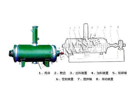 被干燥物料從殼體上方正中間加入,在不斷正反轉(zhuǎn)動(dòng)的耙齒的攪拌下,物料軸向來(lái)回走動(dòng),與殼體內(nèi)壁接觸的表面不斷換新,受到蒸汽的間接加熱,耙齒的均勻攪拌,粉碎棒的粉碎,使物料內(nèi)的水份氣化,在真空系統(tǒng)的作用下,使被干燥物料內(nèi)部水份和表面水份有利的排出,氣化的水份經(jīng)干式除塵器、濕式除塵器、冷凝器,從真空泵出口處放空。